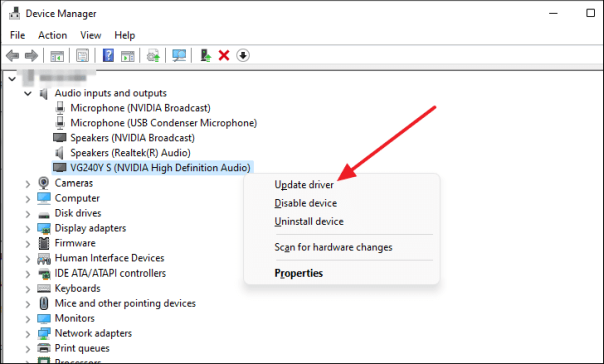 Кроме того, вы можете просто щелкнуть правой кнопкой мыши по аудиоустройству и выбрать «Обновить драйвер».