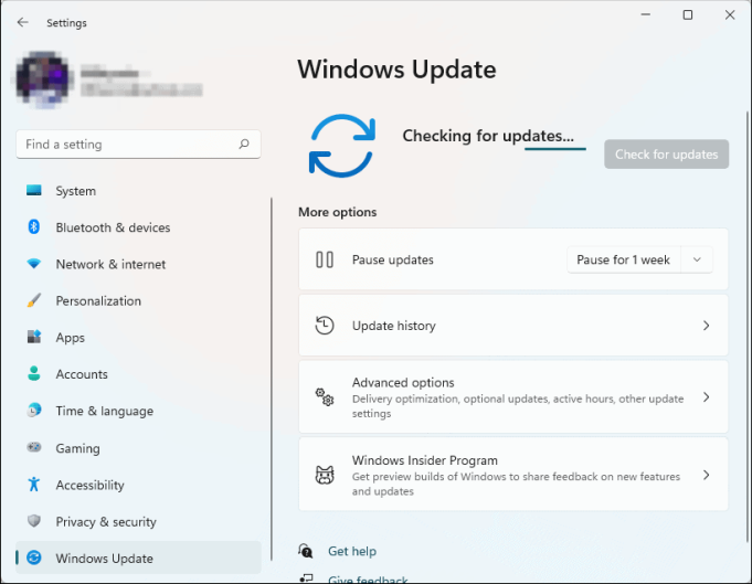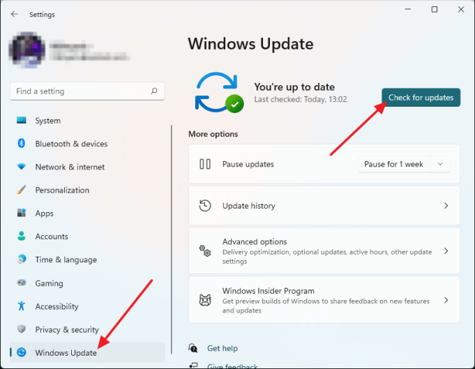 Для начала нажмите Windows+ iна клавиатуре, чтобы открыть меню настроек. В окне «Настройки» сначала нажмите «Центр обновления Windows» на левой панели, а затем нажмите кнопку «Проверить наличие обновлений» на правой панели.