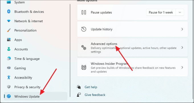 И последнее, но не менее важное: вы также можете проверить дополнительные разделы обновлений, чтобы узнать, доступны ли у вас какие-либо обновления аудиодрайвера. Чтобы перейти к дополнительному обновлению, нажмите Windows+ iна клавиатуре, чтобы открыть меню настроек. В окне «Настройки» нажмите «Центр обновления Windows» на левой панели, а затем выберите «Дополнительные параметры» на правой панели.