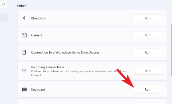 Затем найдите раздел «Другое» на странице и нажмите кнопку «Выполнить» на плитке «Клавиатура», чтобы запустить средство устранения неполадок с клавиатурой.