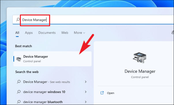 Чтобы удалить драйвер клавиатуры, откройте меню «Пуск» и введите «Диспетчер устройств». Затем щелкните плитку «Диспетчер устройств» в результатах поиска.