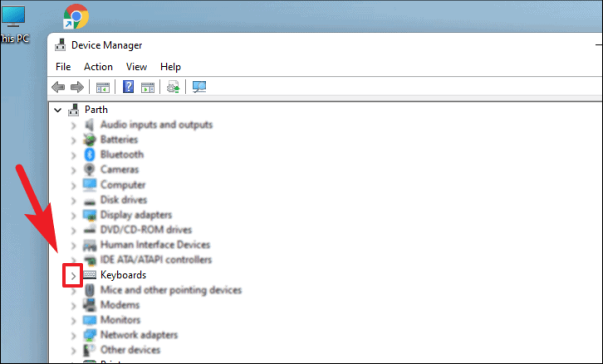 Затем в окне «Диспетчер устройств» щелкните маленький шеврон (боковая стрелка) перед параметром «Клавиатура», чтобы отобразить все установленные аппаратные компоненты.