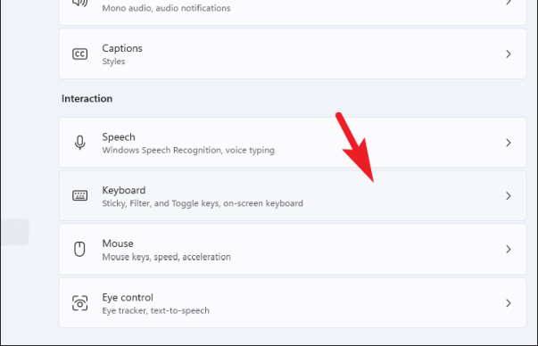 Затем в правой части окна прокрутите вниз до раздела «Взаимодействие» и щелкните плитку «Клавиатура», чтобы продолжить.