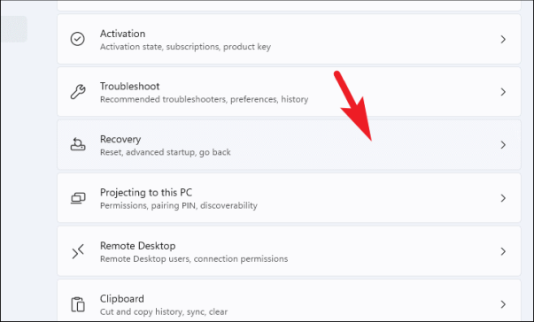 На следующем экране найдите раздел «Параметры восстановления», а затем нажмите кнопку «Сбросить компьютер» на плитке «Сбросить этот компьютер». Это откроет отдельное окно на вашем экране.