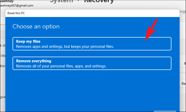 - Сохранить мои файлы: как следует из названия, используйте эту опцию, если вы хотите сохранить свои личные файлы нетронутыми, пока все системные приложения удаляются, а системные настройки возвращаются к новому состоянию.
