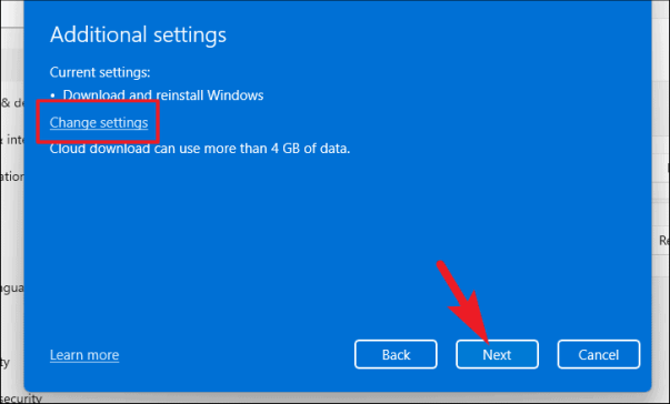 Далее вы будете уведомлены о текущих настройках сброса ПК. Если вы хотите изменить какие-либо настройки, нажмите «Изменить настройки». В противном случае нажмите кнопку «Далее», чтобы продолжить.