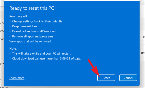 Затем WIndows перечислит все последствия сброса настроек на вашем ПК, прочтите их и нажмите кнопку «Сброс», чтобы начать процесс сброса на вашем компьютере.