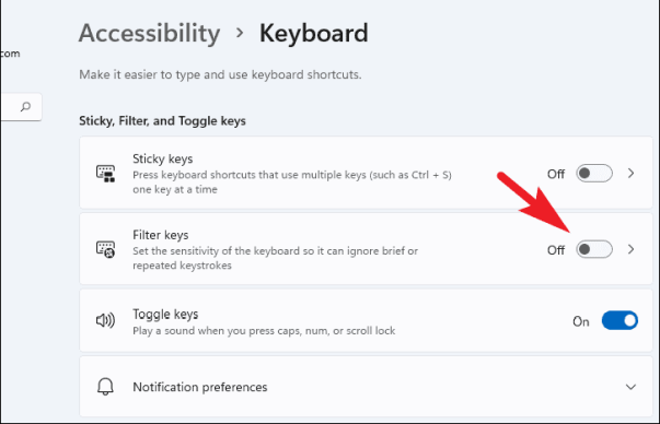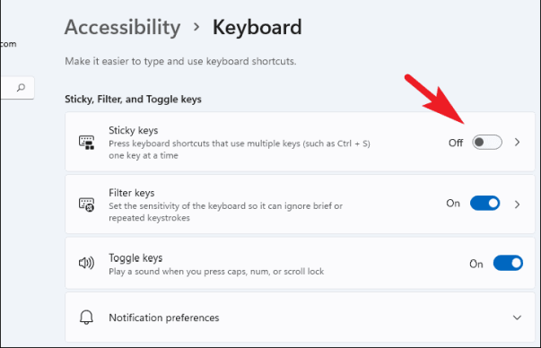 Затем в разделе «Закрепленные клавиши, фильтры и переключатели» найдите плитку «Закрепленные клавиши» и щелкните переключатель, присутствующий на плитке, чтобы перевести его в положение «Выкл.».
