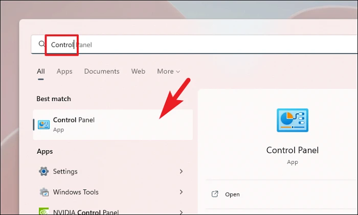 Перейдите в меню «Пуск» и введите Control, чтобы выполнить поиск. Затем в результатах поиска нажмите плитку «Панель управления», чтобы продолжить.