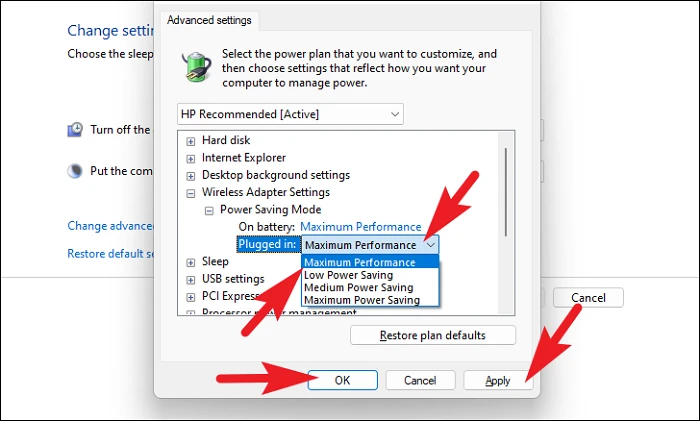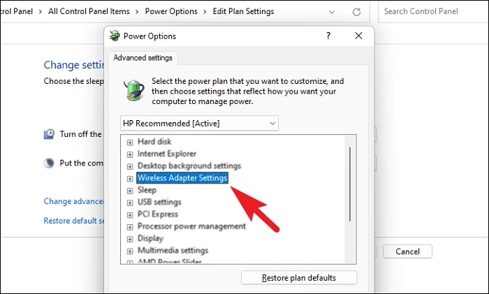После этого в окне «Электропитание» найдите «Настройки беспроводного адаптера» и дважды щелкните параметр, чтобы развернуть раздел.