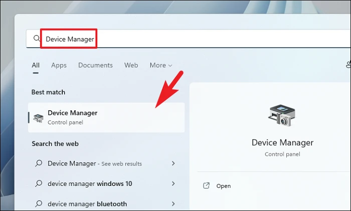 Сначала откройте меню «Пуск» и введите «Диспетчер устройств», чтобы выполнить поиск. Затем в результатах поиска нажмите на плитку «Диспетчер устройств».