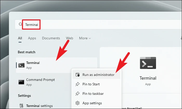 Сначала перейдите в меню «Пуск» и введите «Терминал», чтобы выполнить поиск. Затем в результатах поиска щелкните правой кнопкой мыши плитку «Терминал» и выберите параметр «Запуск от имени администратора».