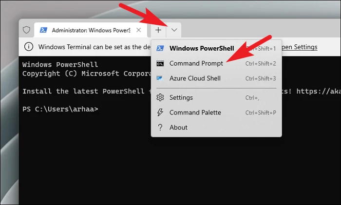 Затем нажмите на шеврон (стрелка вниз) и выберите параметр «Командная строка».