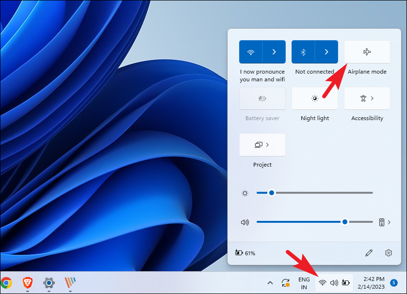 На панели задач нажмите значок «Wi-Fi». Затем нажмите значок «Режим полета» в меню наложения. Подождите пару минут, а затем нажмите еще раз, чтобы отключить его. Затем проверьте, сохраняется ли проблема.