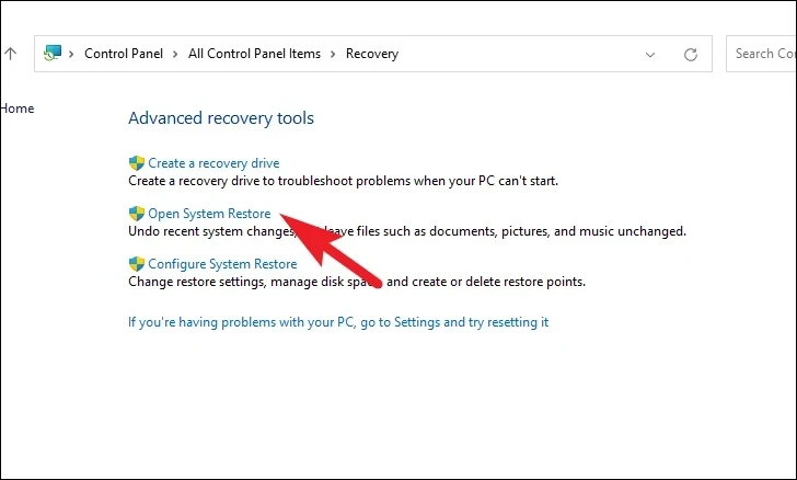 Далее выберите из списка пункт «Открыть восстановление системы». Это откроет отдельное окно на вашем экране.