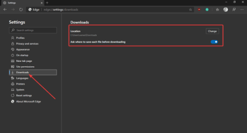 - Если вы хотите, чтобы вас спрашивали, где вы хотите сохранить файл, каждый раз, затем переключите параметр Спросить, где сохранить каждый файл перед загрузкой, переключитесь во включенное положение.