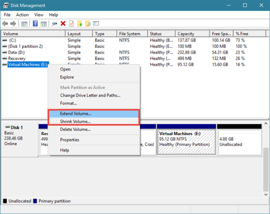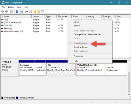 Обратите внимание, что если рядом с разделом нет свободного нераспределенного пространства, его нельзя увеличить. В этом случае опция «Расширить объем» будет выделена серым цветом. Точно так же, если раздел, который вы хотите сжать, полон данных, вы не можете уменьшить его, так как на нем не осталось места для удаления. В этом случае опция «Уменьшить объем» будет выделена серым цветом.