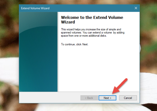 Если вы хотите увеличить размер раздела, а рядом с ним есть свободное место, после того как вы нажмете опцию «Расширить том», «Управление дисками» откроет «Мастер расширения тома». В нем нажмите или нажмите Далее.