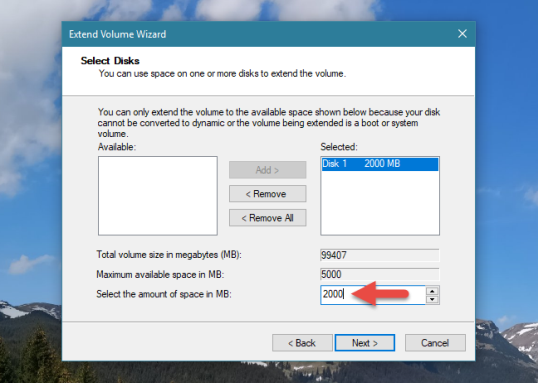 Если вы хотите добавить меньше места в раздел, вы можете указать его в поле «Выберите объем пространства в МБ» в нижней части окна. Как только вы приняли решение, нажмите «Далее», чтобы продолжить.