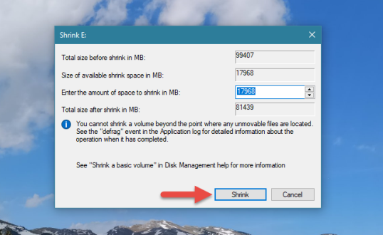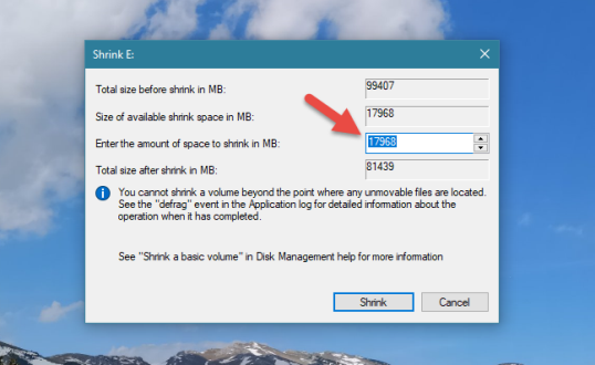 В первых двух полях этого диалогового окна инструмент «Управление дисками» сообщает вам размер раздела прямо сейчас и сколько места вы можете извлечь из него. Это значение отображается в поле «Размер доступного уменьшенного пространства в МБ» и рассчитывается Windows на основе количества свободного места на разделе и расположения любых неподвижных файлов, найденных в этом разделе.