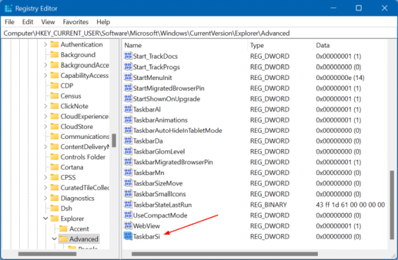 Шаг 4: Наконец, дважды щелкните на TaskbarSi значения, установите 0 для малых, 1 для средних и 2 больших иконок.