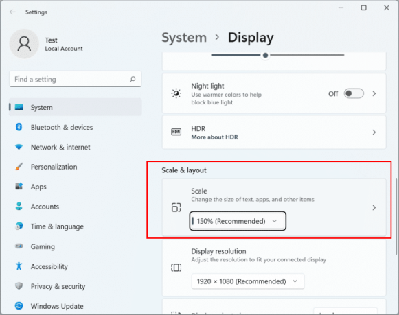 Шаг 2. Здесь, с правой стороны, в разделе «Масштаб и макет» выберите масштаб из раскрывающегося списка, чтобы применить его. Значение масштаба по умолчанию — 100%. Мы предлагаем вам выбрать масштаб, рекомендованный Windows 11.