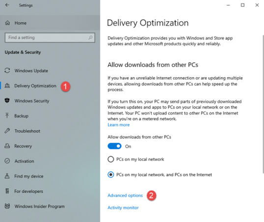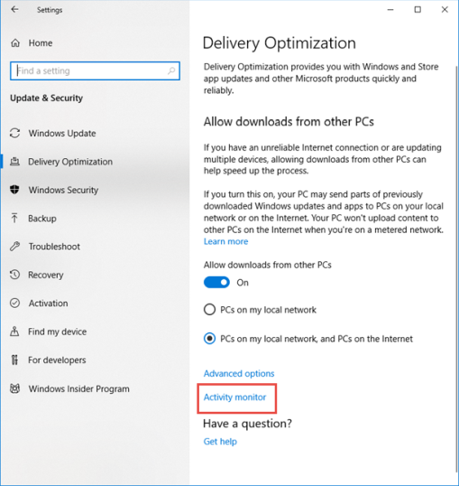 Через несколько дней после включения параметров, которые обсуждались ранее, вы можете вернуться к разделу «Оптимизация доставки» и проверить, используется ли пропускная способность для обновлений Windows 10. Для этого нажмите или коснитесь ссылки Монитор активности.