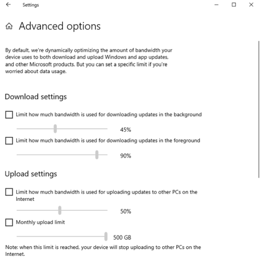 Вы видите несколько параметров и галочек для настроек загрузки и настроек загрузки . По умолчанию опция не выбрана, а это означает, что Windows 10 использует вашу пропускную способность интернета так, как считает нужным.