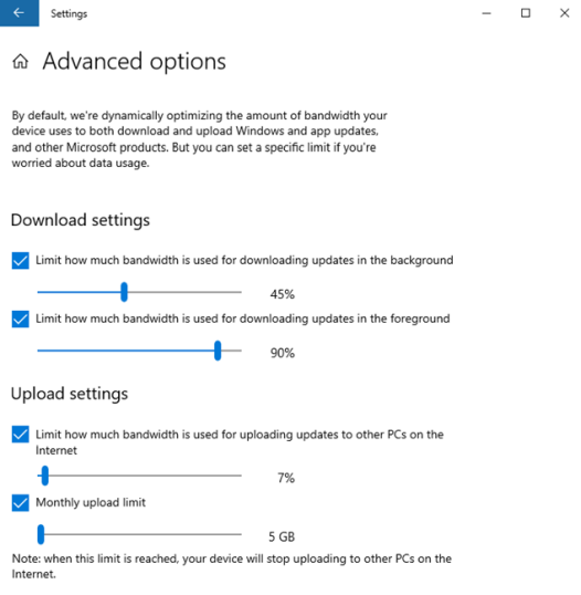 - Ограничьте полосу пропускания, используемую для загрузки обновлений на другие ПК в Интернете — если вы установили Оптимизацию доставки для загрузки и выгрузки обновлений Windows 10 с других ПК через Интернет, этот параметр контролирует, сколько пропускной способности вашего Интернета используется для загрузки. данные.