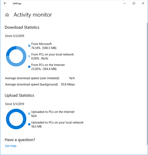 Вы видите отчеты со статистикой загрузки и статистикой загрузки, где вы узнаете, сколько обновлений Windows 10 было загружено в мегабайтах из разных источников: Microsoft, других компьютеров в локальной сети и других компьютеров в Интернете. Вы также видите, сколько обновлений загружено на компьютер с Windows 10 другим пользователям в Интернете или локальной сети.