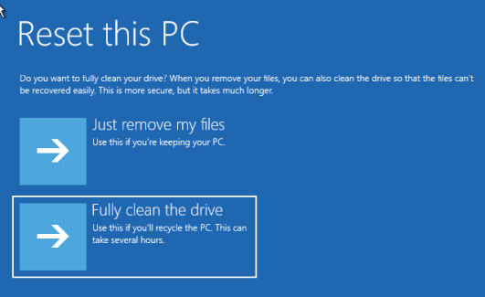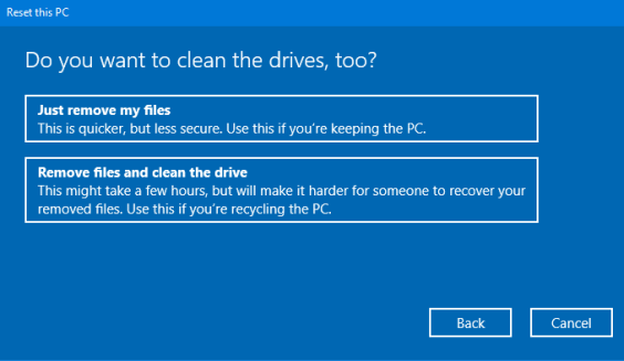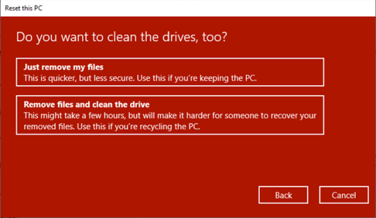 Если вы уверены, что это именно то, что вам нужно, и вы готовы сбросить установку Windows 10, у вас остается еще один выбор: «Просто удалить мои файлы» или «Удалить файлы и очистить диск». Второй вариант выполняет то же, что и первый (удаление файлов), и добавляет операцию очистки, которая предотвращает восстановление ваших данных в будущем.