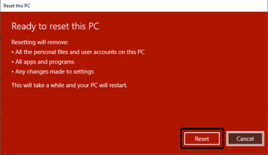 Когда он будет готов, Windows 10 сообщит вам об этом и покажет влияние процесса сброса. Сброс удаляет: