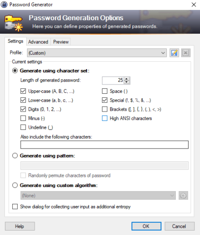 Вам действительно нужно только создать с использованием набора символов . Выберите длину вашего пароля (хорошая длина — минимум 25 символов). Затем выберите, какие типы символов вы хотите в пароле.