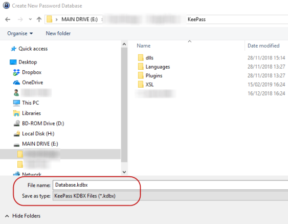 Нажмите OK, и следующим шагом будет создание и сохранение файла KDBX (формат файла базы данных паролей KeePass).