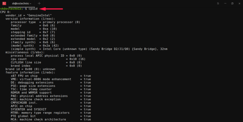 После установки cpuid получите информацию о процессоре с помощью команды: