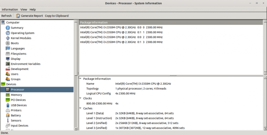 После установки hardinfo запустите его из тире или меню. Щелкните параметр «Процессор» в разделе «Устройства» на левой панели, чтобы получить сведения о ЦП/процессоре: