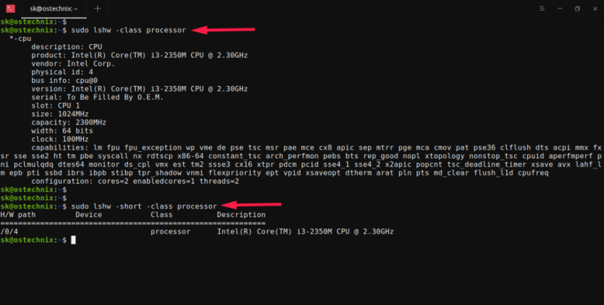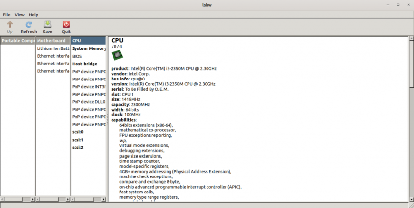 $ sudo lshw -class processor *-cpu description: CPU product: Intel(R) Core(TM) i3-2350M CPU @ 2.30GHz vendor: Intel Corp. physical id: 4 bus info: cpu@0 version: Intel(R) Core(TM) i3-2350M CPU @ 2.30GHz serial: To Be Filled By O.E.M. slot: CPU 1 size: 987MHz capacity: 2300MHz width: 64 bits clock: 100MHz [...]