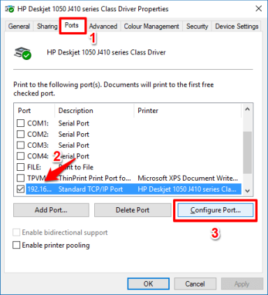 Шаг (6): В случае, если вы все еще не можете найти IP-адрес принтера, перейдите на вкладку «Порты» и выберите порт, для которого включена галочка. Наконец, нажмите на кнопку «Настроить порт».