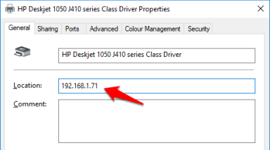 Шаг (5): В диалоговом окне Свойства принтера перейдите на вкладку Общие, и вы увидите IP-адрес вашего принтера в разделе Расположение.