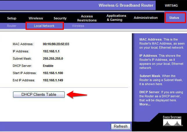 Шаг (3). После входа в систему найдите таблицу клиентов DHCP или найдите любую ссылку на список клиентов DHCP в разделе «Состояние» → «Локальная сеть».