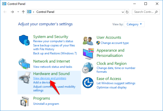 Шаг (2). В окне панели управления выберите параметр «Просмотр устройств и принтеров», который находится в разделе «Оборудование и звук».