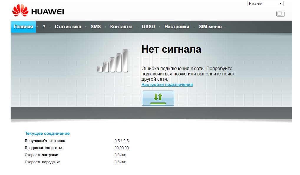 - Главный дисплей показывает текущую скорость соединения, полученный и отправленный трафик, а также продолжительность сеанса. Мы идём в предпоследнюю вкладку «Настройки» на верхней панели. Либо переходим по ссылке «Настройки подключения» в центре окна под сообщением «Нет сигнала».