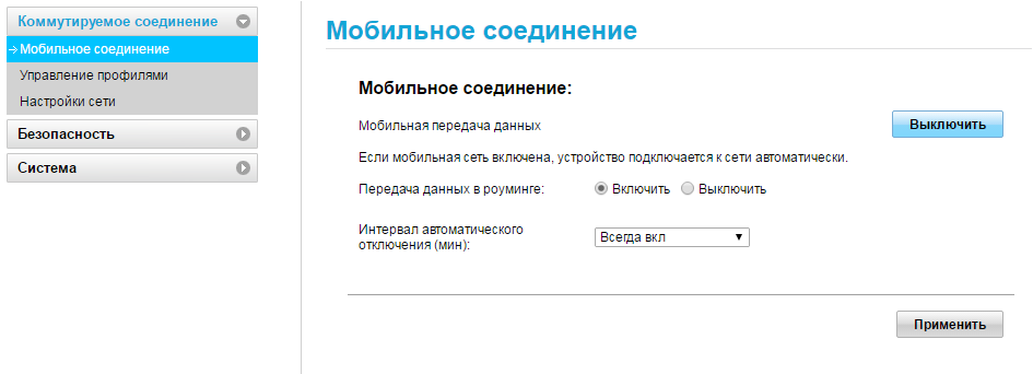 - В первом блоке для мобильного подключения активируем передачу данных по сети, если она ещё не включена. В зависимости от условий тарифа, включаем или отключаем передачу для роуминга. В интервале ставим «Всегда включено», если не хотим, чтобы модем отключался после определённого периода бездействия. Не забываем нажать на «Применить».