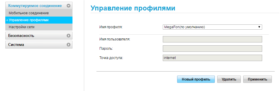 - Самая важная вкладка — «Управление профилями». Изначально модем сам настраивает профиль в зависимости от вставленной в него «симки». Если у вас Билайн, оставьте по умолчанию созданный профиль, а если Мегафон или Теле2, настройте аккаунт самостоятельно. Для этого жмём на первую клавишу под анкетой «Новый профиль».