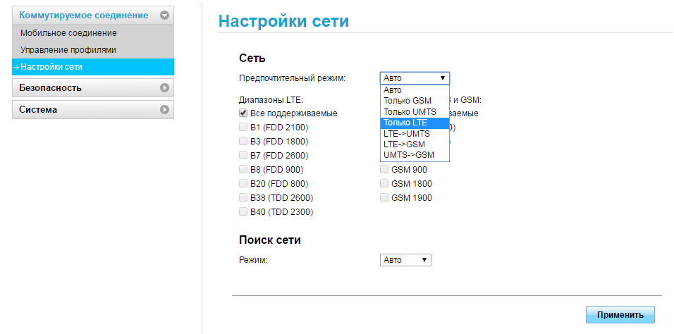 - В параметрах сети ставим тип мобильной сети, к которой вы хотите подключаться: UMTS (3G) или LTE (4G). Если вы постоянно бываете в разных районах города или в разных населённых пунктах, в которых не всегда ловит 4G, рекомендуется поставить значение «Авто». Так модем будет сам переключаться на тот стандарт, который есть в текущем местоположении. Устанавливаем также все поддерживаемые диапазоны и применяем изменения.
