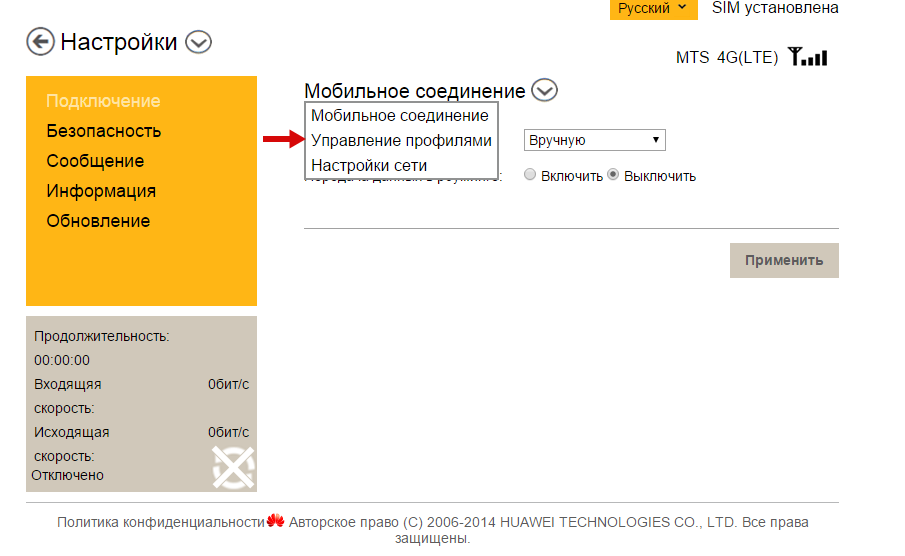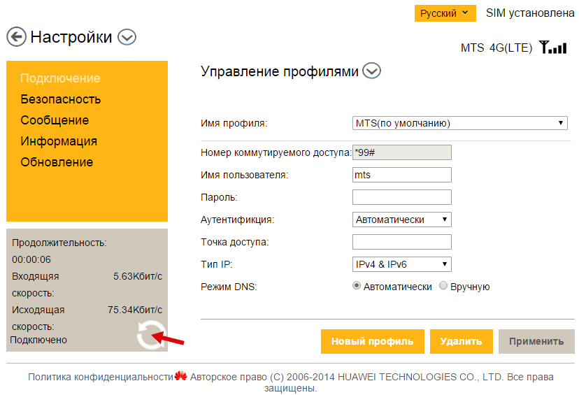 Рассмотрим также настройку подключения в установленном ПО модема: