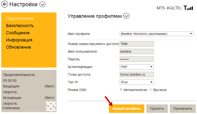 - Нажмите на жёлтую кнопку «Новый профиль». Если у вас Билайн, ничего создавать опять же не нужно — используйте аккаунт по умолчанию.