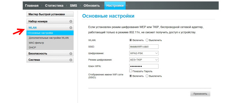 Многие модели модемов USB поддерживают функцию Wi-Fi. Если она присутствует в вашем сетевом устройстве, в меню веб-оболочки будет присутствовать специальный раздел WLAN. В основных настройках можно активировать точку доступа, задать ей имени, а также пароль (ключ WPA). В шифровании лучше всего поставить WPA2-PSK.