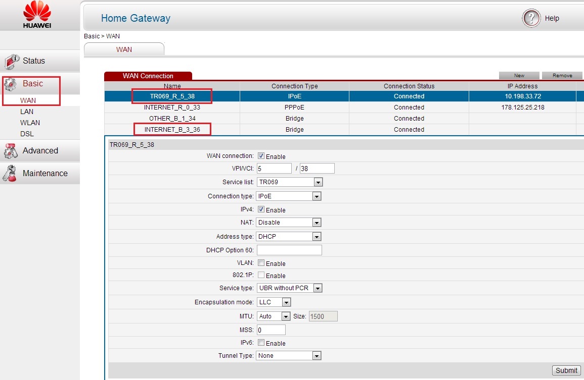 - В разделе Basic будет несколько вкладок для настройки соединения. В первой WAN можно поменять тип подключения, активировать интернет-протоколы IPv6 и IPv4 — в зависимости от того, какой протокол поддерживает ваш провайдер. Чтобы узнать эту информацию, свяжитесь с его техподдержкой.