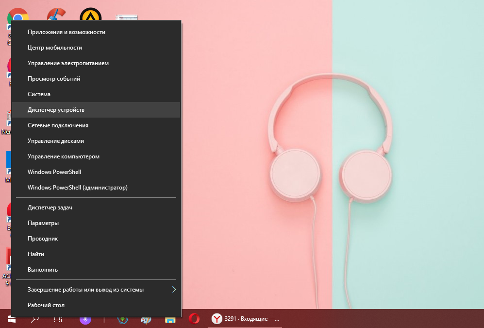- Подключите модем в ПК и зайдите в «Диспетчер устройств». Если у вас «Виндовс» 10, достаточно щёлкнуть по значку «Пуск» и выбрать программу в списке.